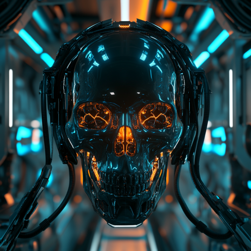 3D render front view of matte black cyborg skull head inside a futuristic device, thick sci fi cables coming from all directions, cyan and orange lighting from sides, dark poorly lit sci fi medical station background, light only from the ceiling, octane render, 4k details