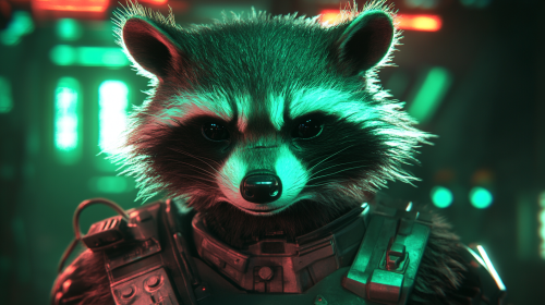 a cyborg raccoon , cyber , green neon light , futuristic, hyper detailed , insane detail , octane render , cinematic lighting , kodak , --v 6.1 --ar 16:9