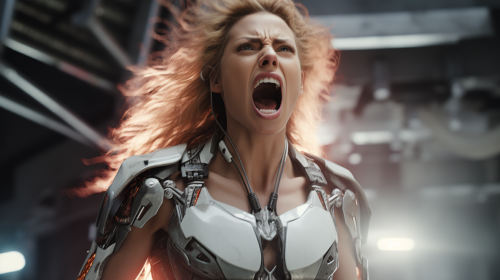 hyper-realistic film still, full body shot, female cyborg warrior screaming at viewer --ar 16:9 --style raw