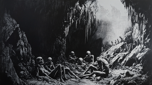 A haunting vision of the ancient Mesopotamian underworld from the Epic of Gilgamesh, depicted in an old black and white etching style. A shadowy 'House of Dust' with bound souls, shackled and weary, sitting in dark, desolate surroundings. The figures are thin and ghostly, with hollow eyes, as they are fed rocks and clay in an atmosphere of despair. Dark, jagged architecture, with crumbling walls and dust-laden air, adds a haunting sense of ancient decay. The scene is intricate, with detailed etching-like lines and shadowy tones, evoking the eerie and oppressive ambiance of a forsaken realm. --ar 16:9