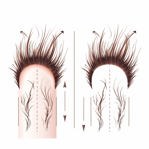 A minimalist medical illustration showing an early stage of hair thinning. On the left, slightly weakened hair strands, subtly thinning, and on the right, stronger, fuller hair strands after treatment. Arrows visually indicate the transition between the stages. No text, only clean visual elements, white background, simple and professional, vector style --no text --v 6.0