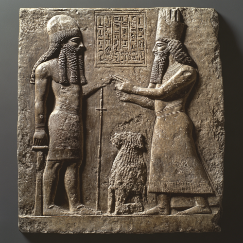 A grand historical panorama depicting the rise and fall of Mesopotamian civilization, featuring ancient cities of Assyria and Babylon on the left, showcasing majestic city walls, palaces adorned with bas-reliefs, and bustling markets filled with merchants and soldiers. In the center, a wide river symbolizes the flow of time, with fertile lands and irrigation systems on one bank, while Greek and Roman architecture, such as grand temples and open squares filled with diverse people, is depicted on the opposite bank, illustrating cultural inheritance. In the foreground, a large clay tablet with cuneiform writing is being studied by scholars and students, representing the legacy of knowledge. Highlight agricultural techniques with farmers using irrigation and waterwheels. In the upper part, blend images of Mesopotamian deities like Inanna with Greek gods like Aphrodite, symbolizing religious syncretism. Include a marketplace scene with a judge upholding order, referencing the Code of Hammurabi. The overall atmosphere is warm and rich in colors, transitioning from golden dusk to deep night, capturing the depth of history and the continuous flow of civilization --ar 16:9