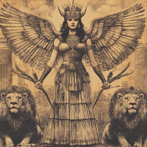 A superhero illustration of Ishtar, the Mesopotamian goddess of love, beauty, and war, portrayed as a beautiful young woman. Wearing a horned and tiered crown, symbolizing the sacred mound. Her dress was is tiered, similar to those worn by other major Sumerian deities. . She is a goddess of war, with a bow and arrow. She has wings. She is wearing a crown with an an eight-pointed star. She is standing on the backs of two lions by lions, with date palms in the background. She is a mighty warrior ar2:3