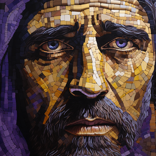Cain from the Bible with shadows over his eyes, in the style of animated mosaics, dark yellow and violet, photorealistic detail, mesopotamian art, lithograph, massurrealism