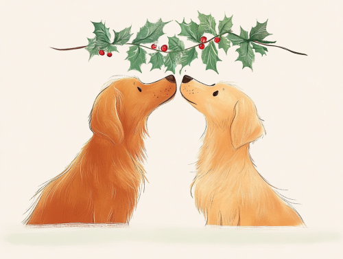 illustration of a two Golden Retriever Dogs standing nose to nose with each other with mistletoe above them, drawn in the style of Oliver Jeffers, soft light, pastel colors, Christmas theme, childrens book illustation --ar 4:3 --v 6.1