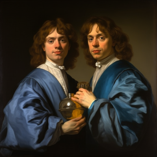 Anthony van Dyck oil portrait of 2 English gentlemen with curly brown hair, each holding a tiny brown bottle, main colours: cyan and yellow --no moustache
