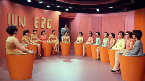 1970 TV game show: children choose unhappy grannies trapped in small boxes, crying, pastel colours, smarmy emcee, --style raw --weird 800 --aspect 16:9