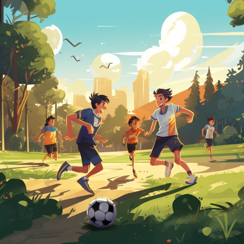 constructivism art style of several 12 year olds playing a pick up game of soccer in the park, laughing and running simple flat shading dramatic lighting --v 5.2