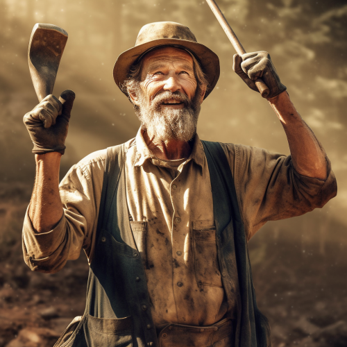 realistic photo, a gold prospector stands facing the camera, hands raised in victory, in one hand is a pick axe --s 750 --v 5.0