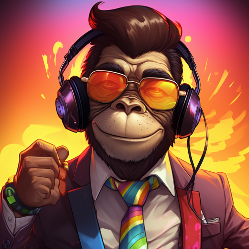 a dancing cartoon monkey with ranbow colors. give him shades, a gaming headset, a classy suit, and a warm smile