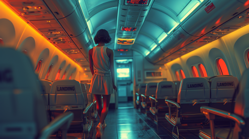 Imagine an engaging image that While a young male passenger is dancing inside the plane, the stewardess shouts at him , word "LANDING" written on the SCREEN , full body, hdr, color grading, real photo , Super resolution, ultra detailed, detailed face, wtihe european, Photorealistic, commercial photography, Sony A7R --ar 16:9 --s 750 --v 6.0 --style raw