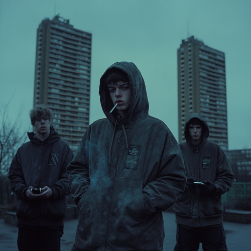 a gang of young men on a london estate 2024 wearing hoodies and smoking weed. They pose like it's the last supper. enchanted urban landscape. dark fantasy. towerblocks of flats behind them. brutalism, concrete. it is morning in the winter time.