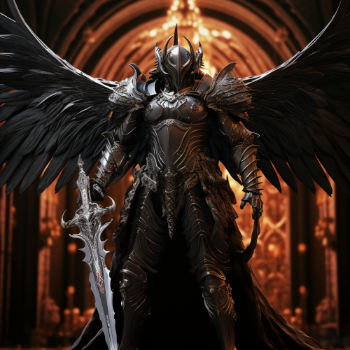 dark angel knight protecting temple entrance holding one sword, high fantasy, digital art, masterpiece painting, ultra detailed, ultra high definition, 8K resolution, 3D shading, superior quality, cover illustration, complex design, fang amulets highlights, deep rich vibrant colours, hyperrealistic, meticulously hyper detailed, artstation