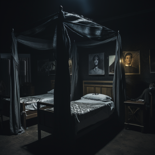 tranquil bedroom, with a canopied bed draped in soft, flowing linens and surrounded by floating lanterns casting gentle glows, walls decorated with delicate tapestries telling stories of a magical world, a window reveals a starlit night sky full of twinkling stars and a soft, silvery moon, composition focuses on the elegance of the bed juxtaposed with the serene window view, the mood is dreamy and comforting, enveloping the viewer in a peaceful embrace, creating a sense of wonder and calm, depicted in enchanting digital art style. --ar 16:9 --niji 6