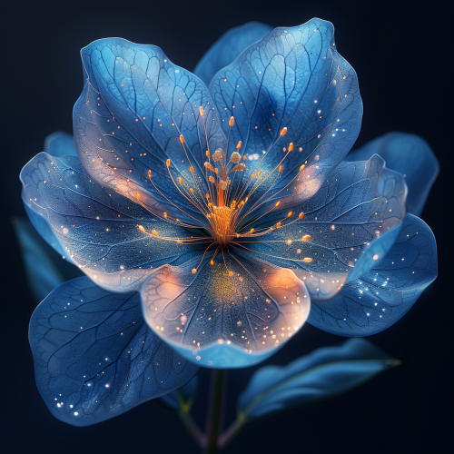 in 2d digital art but somewhat realistic, A delicate, silver-blue flower with thin, drooping petals that curl inward like a bell. The plant’s stem is covered in a fine layer of ash, and it releases a subtle glow when touched. The flower is faintly luminescent in the dark.
