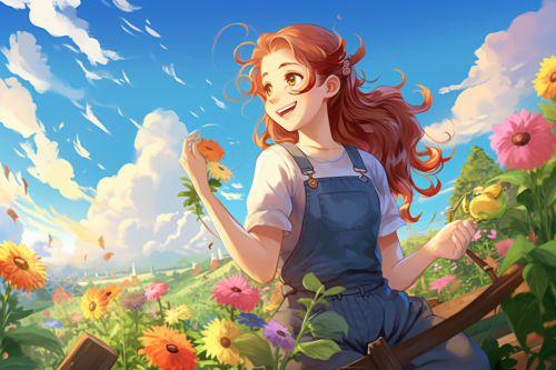 cartoon style, soft color, casual art, garden, flowers, a 16-year-old woman with light brown hair, ponytail, female gardener, rainbow sky --ar 9:6 --v 5.2