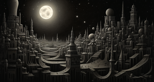 dark city siluette with moon, by MC Escher, simple brown lead pencil drawing, --ar 30:16