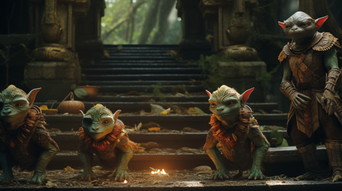 a cinematic movie shot of tan skinned tribal Lizardfolk from Dungeons and Dragons on their knees on the steps of a jungle temple bowing down and offering bowls of goods and food to a short little Halfling from Dungeons and Dragons that is wearing a suit fo armor, dynamic lighting, red and green overtones, sad and bright, 9k, --aspect 16:9