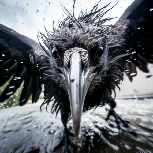 Closeup wide angle dramatic photo, action, upshot of a black crow diving through the air, flash, fast shutter, detailed eyes, intricate feathers, raining storm. --style raw