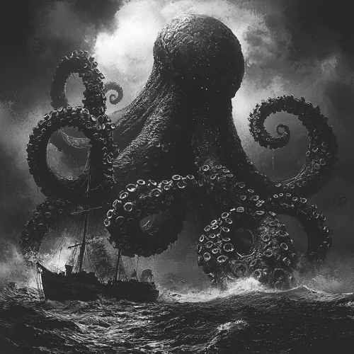 From the dark depths of the ocean, a colossal creature begins to emerge, breaking the calm of the sea surface. Its tentacles, thick as ancient trees and covered in suction cups that shimmer in the moonlight, rise slowly, dripping with salt water as they writhe in the air. The beast, half shadow and half monster, is revealed in all its splendor, its body a scaly, dark texture, as if it had remained hidden for centuries in the deepest parts of the ocean. With a swift, calculated movement, one of its tentacles envelops the small fishing boat, making its timbers creak under the relentless pressure. The terrified sailors try to escape as the monster drags its catch into the abyss, slowly plunging the ship into the dark depths, as if it were an insignificant toy in the clutches of an ancient sea god. --q 2 --s 250 --v 6.1