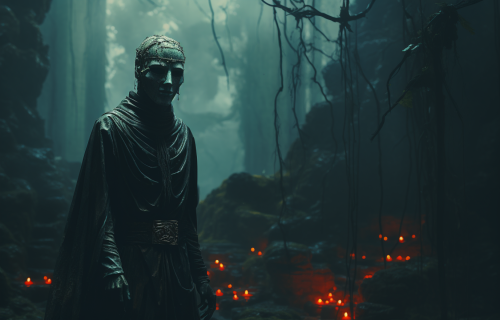 tall man wearing a mask of a greek statue , gloomy atmosphere::4 90s anime style, Dark Paradise::2 Screenshot from a 1980s shoujo, 80's anime style. fantasy, movement, Graphic art novel, rule of thirds, still shot from tv show, mystical setting, insanely detailed, masterpiece, 8k, beautifully color coded, vibrant color, color scheme, high contrast, dramatic lighting ::1 --ar 14:9 --uplight --no robots --s 250
