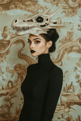 Profile full body Portrait of a woman in a black dress with a dragon skull on her head, covering part of her face, with very large black eyes. She is wearing a black dres in front of a beautifully posed wallpaper --ar 2:3 --v 6.1