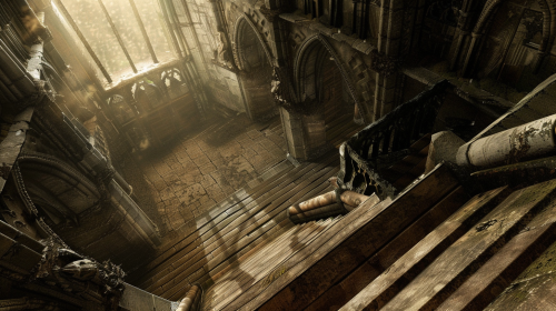 a view of a wooden platform inside the top of a cathedral, dnd style, warhammer, dark fantasy, --ar 16:9