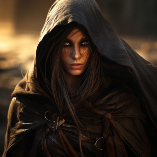 Female elf assasin, wearing leather armour and hooded cloak, charactuer portrait, mad max, dnd, forgotten realms, ultra detailed, realistic