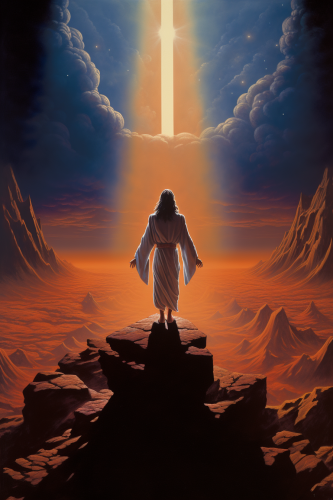 1970s dark fantasy sci fi poster drawing of Jesus Christ stepping out of a time machine in the desert in the style of artist Michael Whelan --ar 6:9