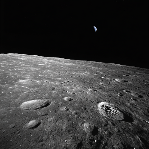 The surface of the moon photographed with a Canon EOS R3 with a 50mm lens and a flash. Maybe near the footprints and some space eqipment. In the distance you can see earth and a satllite.
