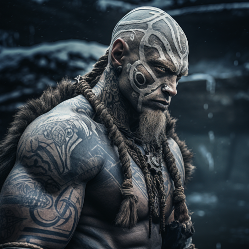 barbarian albino warrior, shaman, viking dark priest, albino appearance, scars and clan tattoos of triquatra on body, bald with tattos on head, unnaturally blue skin, muscular body, primal viking shaman costume, furious look, worships the dark gods, water and sea on background, very realistic style, dark fantasy scenery, very detailed