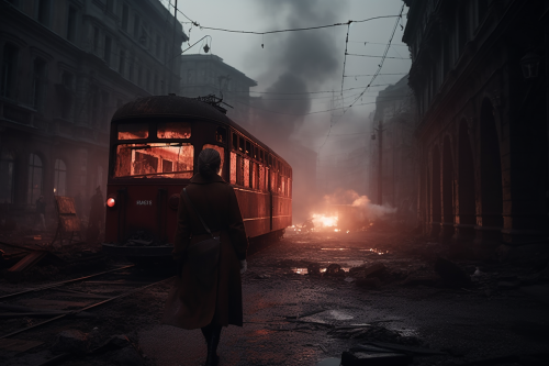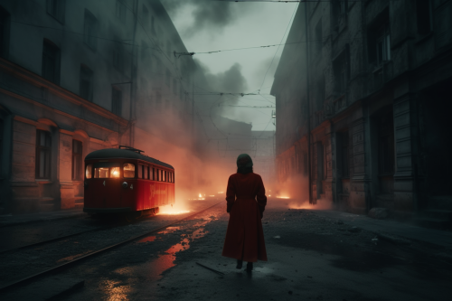 city ruins, red fog, dark night, only red flares light, scared woman nurse running in old tram, Warsaw uprising, dynamic fight scene, boombing, dust, clouds and fog vfx --ar 3:2 --stylize 500 --v 5.0