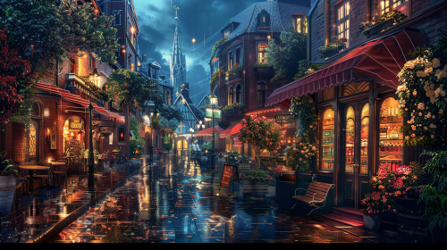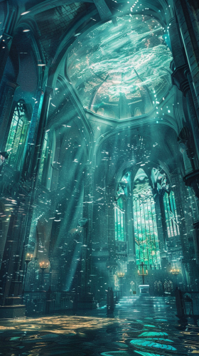 Beautiful, crystal, busy other world, RPG style background, medieval European style, a little dark, fantasy world, other world, other world background image, mysterious, indoors. Big church, huge city, shopping street, water wallpaper --ar 9:16 --v 6.0