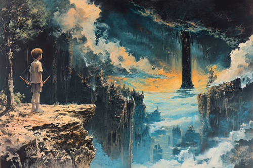 Fantasy lithograph. 1960s fantasy comic book, boy with bow standing on ledge looking down at a fantasy world. In the far distance looms a giant dark structure. Beautiful day. Surrealism --ar 3:2 --v 6.0
