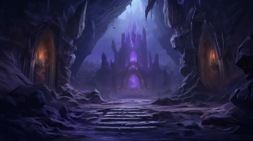 Environment concept art of a fantasy portal map, ruined world, fantasy medieval cave, sparks, portal to another world fantasy, background fantasy cosmic, ruined stones, magic backgroud, sky, ruined temple portal, violet obscure palette, dark atmosphere, cinematic --ar 16:9