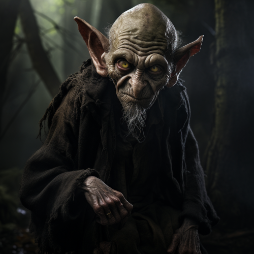 A goblin in a world of secrets and darkness that is inhabited by shadows, dark fantasy aesthetic, photorealistic, wide shot.