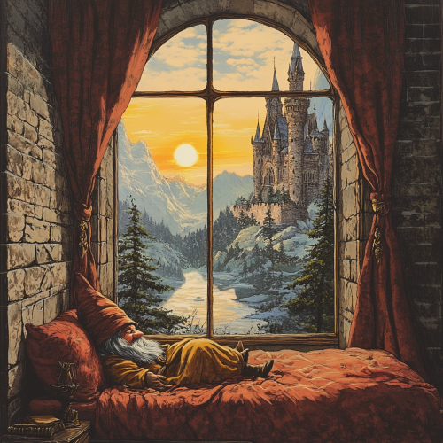 A 1970’s, vintage dark fantasy book cover paper art dungeons and dragons style drawing of a gnome in bed. The window shows a sunrise with a castle in the background. Set in a mystical, dark fantasy world --ar 1:1