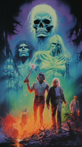 70s dark fantasy poster, film poster layout, vhs cover THE RETURN OF THE LIVING DEAD, rainy cemetery, blue pink green COLORS, oranges glow, unreal, detailed, strange light, glow in the dark, oilpainting, adding a touch of realism and depth, By loish, by alex ross, by frank frazetta --ar 9:16 --s 50 --v 5.2