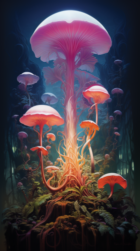 70s dark fantasy poster, film poster layout, vhs cover giantcarnivorous plant, blue pink green COLORS, oranges glow, unreal, detailed, strange light, glow in the dark, oilpainting, adding a touch of realism and depth, By loish, by alex ross, by frank frazetta --ar 9:16 --v 5.2 --s 250