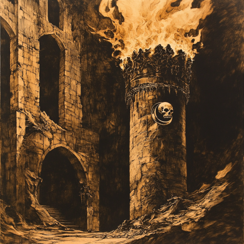 1970’s dark fantasy book cover paper art dungeons and dragons style drawing of a very zoomed scene of a burning silver ring on a skull and bones pillar, in the middle of an hall of medieval castle, in the style of Zdzisław Beksiński and Darrell K. Sweet.