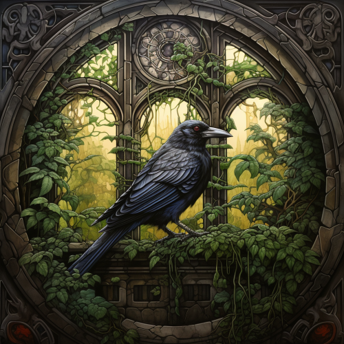Wide shot, 80s Dark Fantasy, Exterior, 9th century, ancient, dark, small town underneath leafy trees, Nordic inspired architecture, Rainy, Leafy green, deep forest, smoky incense, stained glass windows, bronze weathervanes, misty, Soft Ambient Light, Wide Camera Angle, Zoomed Out, medium high contrast, cool tones, Grainy, Surreal, 4k details, Professional Colour Grading, Incredibly Detailed, 60 mm film --ar 4:3 --v 5.1