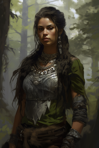 a half body shot of A female orc with straight hair, dressed in traditional norse clothing. Druid. norse style, in the background is a forest in dappled light, d&d digital painting --ar 2:3 --v 5.2
