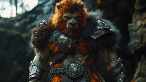 lion man barbarian, walking, full body image, orange and black fur, dark fantasy, armor, action shot, 4k, vivid, 4k cinematic, 4k ultra detailed, 4k hyper detailed, 4k ultra realistic, 4k hyper realistic, 4k photorealistic, --ar 16:9 --v 6.1
