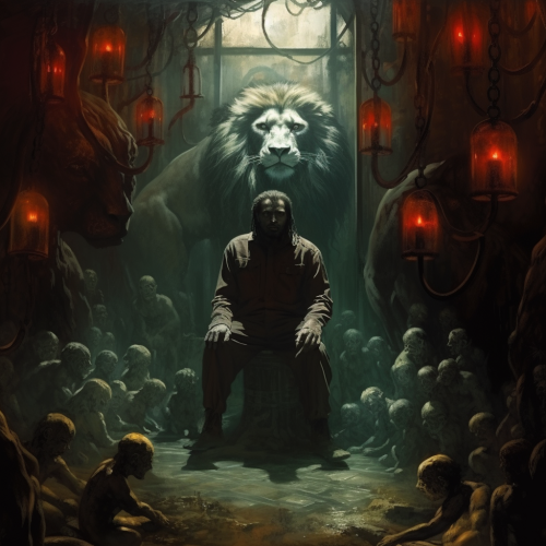 1970’s dark fantasy book cover paper art dungeons and dragons style drawing of the goblin king from The Labyrinth surrounded by goblins with minimalist far perspective --ar 9:16