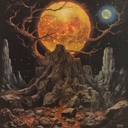 1970s dark fantasy book cover paper art, Dungeons and Dragons Style of a large boulder stuck in a tree, surrounded golden lights