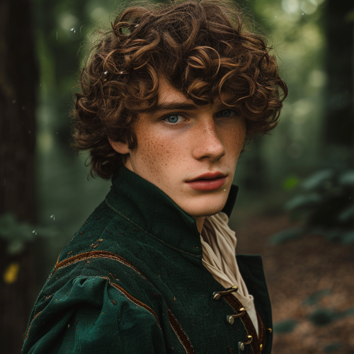 an attractive, realistic fantasy man with brown curly hair and pale skin, wearing fantasy dark green clothing in the woods, friendly face --v 6.0