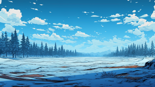 Landscape with some green fir forest in the background. Bright blue sky. Frosty atmosphere. Comic style sketch. --ar 16:9