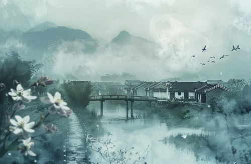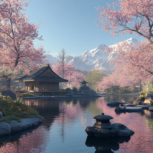 A serene Japanese landscape during cherry blossom season, showcasing traditional wooden tea houses surrounded by blooming sakura trees. Include a tranquil pond reflecting the blossoms, a stone lantern, and distant mountains under a clear blue sky. The scene captures the essence of Japanese culture, with a focus on harmony and natural beauty. Soft lighting enhances the peaceful atmosphere.