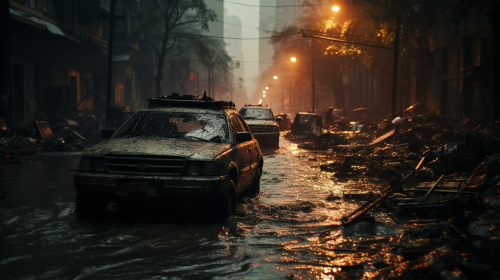 Flooding in the city. Disaster. A tragedy for people. Apocalypse. Lots of water. The city is destroyed. A lot of garbage. Overturned cars. Destroyed houses. The city is dead. It's dark outside. Photorealism, cinematography, 4k --ar 16:9 --s 750