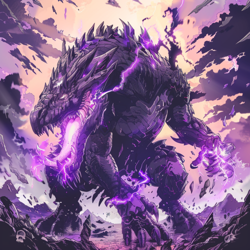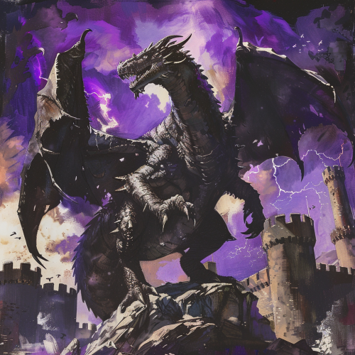 gargantuan black dragon, corrupt and evil, powerful, scary. Purple arcane energy around him. Background is a destroyed castle. Dungeons and dragons fantasy art style. --v 6.0